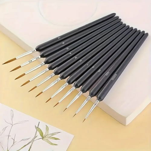 Цей набір з 11 професійних пензлів — ідеальний інструмент для художників, студентів художніх шкіл, дизайнерів і всіх, хто любить творити. Різноманітність розмірів дає змогу виконувати як тонку деталізацію, так і ширші мазки, створюючи складні композиції, пропрацьовані фони та дрібні акценти.